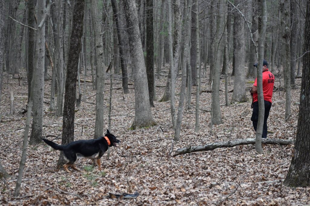 Airscent dogs are trained to search off-leash, accompanied by their handler and support team, and do not require a scent article such as clothing to identify the missing individual. They must be capable of moving off-trail, navigating rough terrain and poor weather for long periods, all while ignoring distractions like wildlife, people, and unusual sounds. Searching independently allows them to cover far more ground than if they stayed close to their handler—making them highly effective assets during a search.